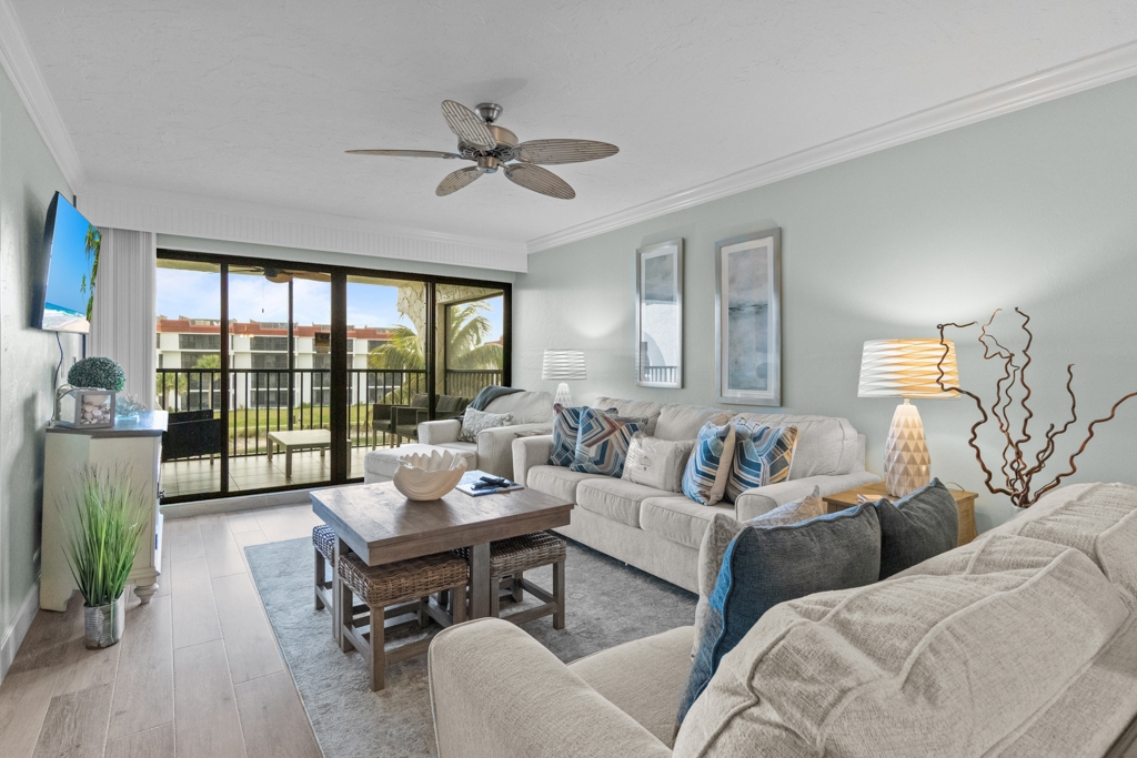 This beautiful 2 bedroom/2 bathroom condo sleeps up to six guests. It has a gorgeous well-equipped modern kitchen with all new stainless steel appliances, granite counter tops, breakfast island, and tray ceiling lighting. The master bedroom has a king sized bed, remote flat screen TV and DVD player, and luxurious private bathroom with walk-in shower and double high vanity. The guest bedroom has a queen and a twin bed, a remote flat screen TV with DVD player. You'll love it here as you relax in the tropical Tommy Bahama style living room which has a queen sized sleeper sofa, remote flat screen TV with DVD player. With a 3rd floor location, you can relax on the screened lanai and take in a GREAT VIEW of the beautiful lush grounds, lagoon, pool and beach! Lots of books, games, and puzzles are provided for all ages in case of that rare rainy day. For your convenience, beach towels, beach chairs, and a beach umbrella are provided.