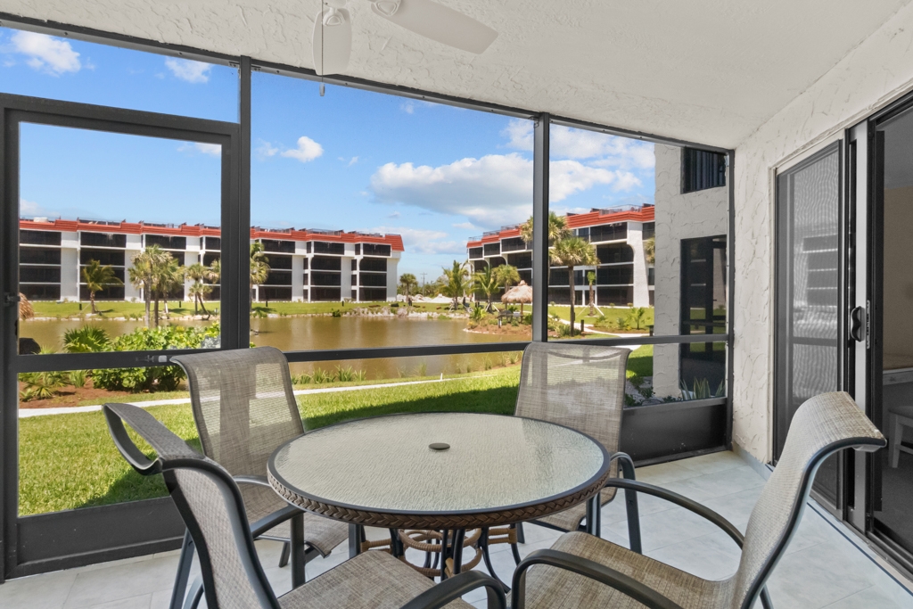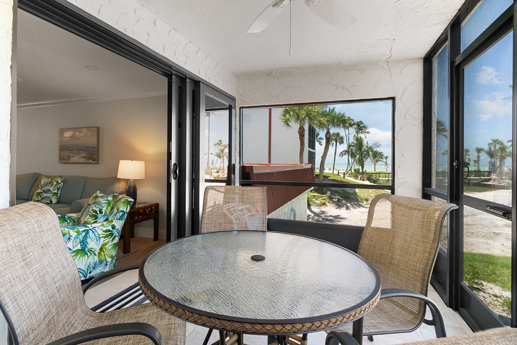 This fully is a remodeled 2-bedroom, 2-bathroom unit, D-7. Boasting a king bed in the master suite and both a queen and a twin in the guest bedroom, along with a sleeper sofa in the living room, it comfortably accommodates up to six guests. Equipped with a full-size washer and dryer and an array of extras, this condo ensures the comfort and convenience of home amidst the tranquility of a tropical island retreat. Situated on the first floor, its prime location offers a clear view of the Gulf from the screened lanai.