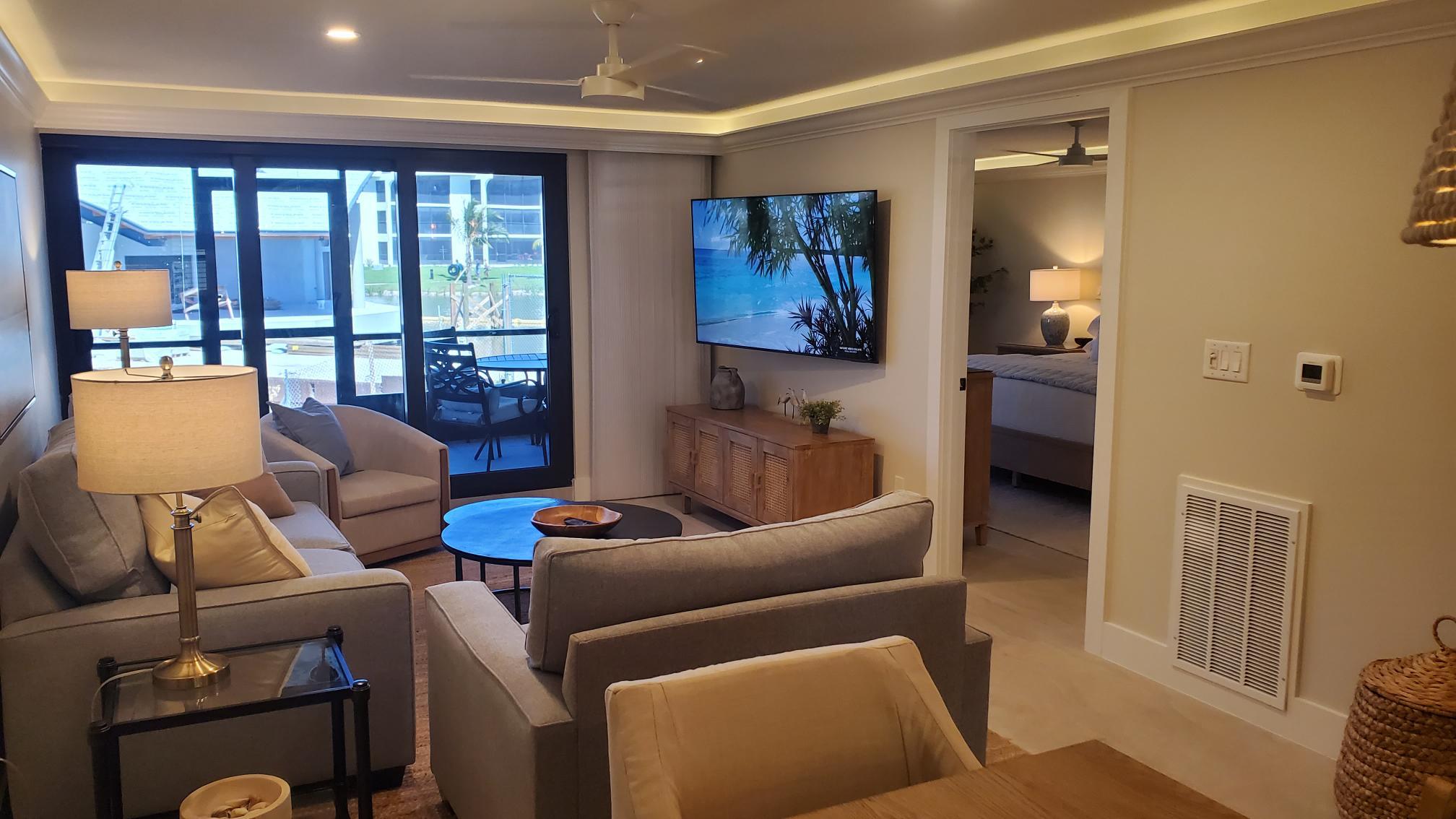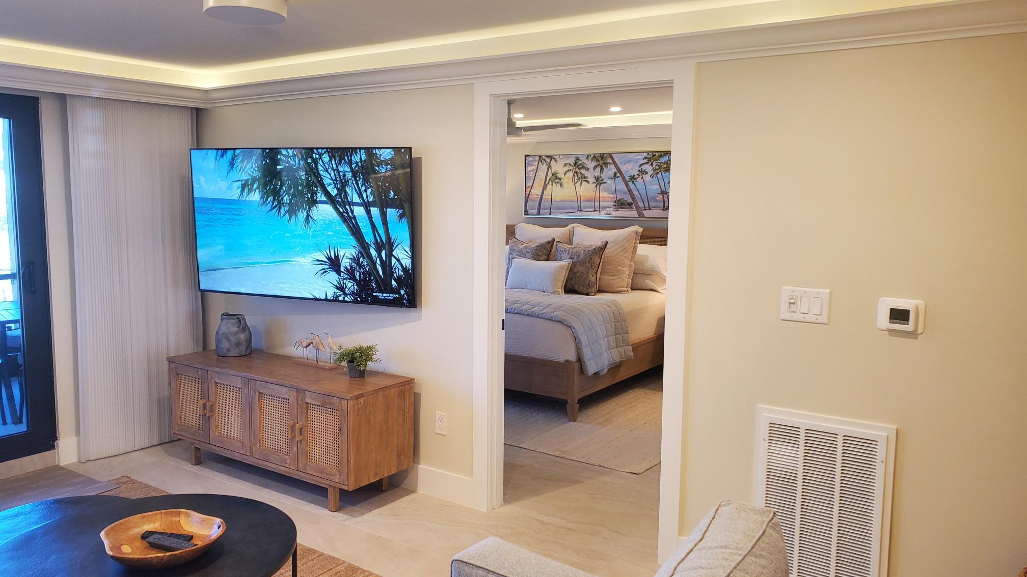 Unwind in a spacious, cozy living area with a plush down-filled sofa (with queen pull-out option), an oversized reading chair, and a wall-mounted smart TV. After a day in the sun, relax with your favorite shows or a good book.