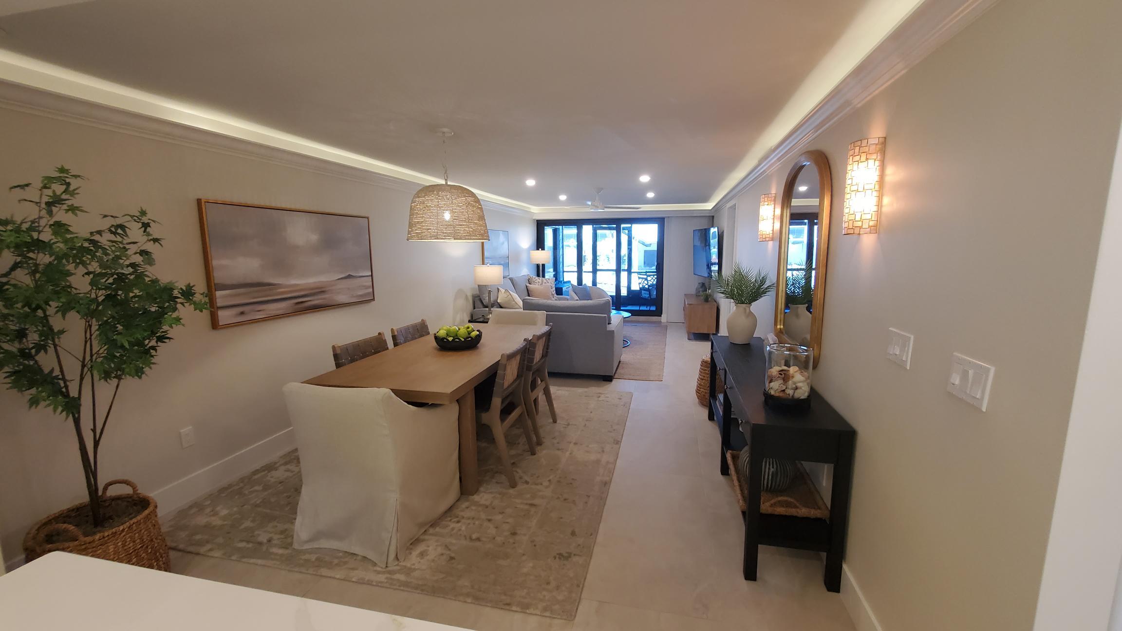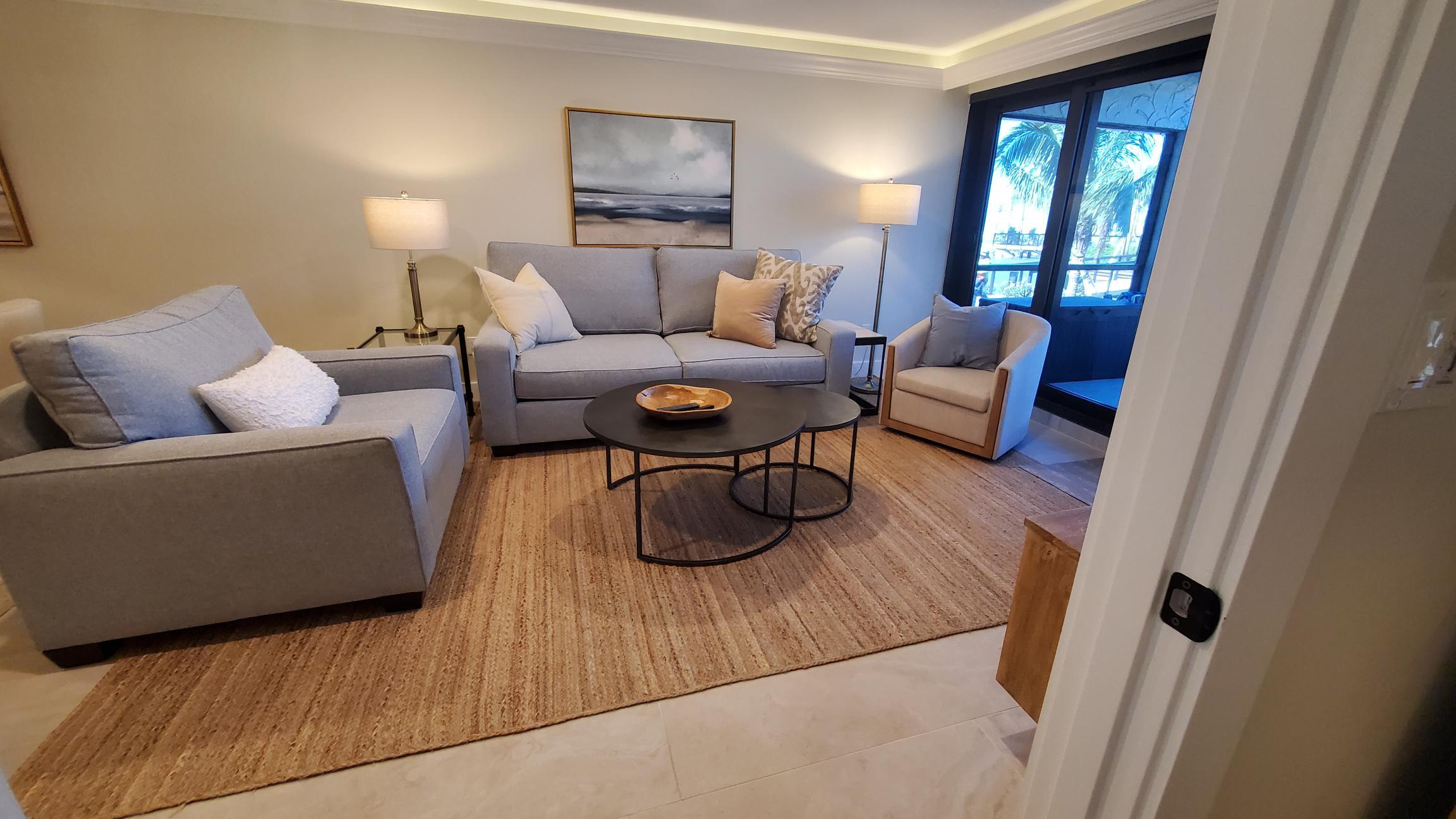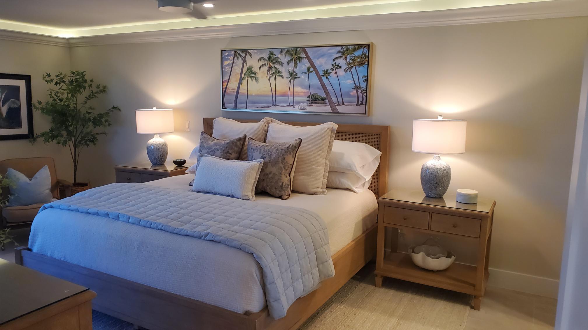 Inside our condo you will fresh coastal Interiors. Our newly remodeled 2BR/2BA ground-floor condo combines modern comfort with timeless coastal charm. Expect a light, airy atmosphere; soft sandy hues, ocean blues, natural textures, and crisp whites create a true retreat. Being on the ground floor means step-free access to the lanai, pool, and beach.