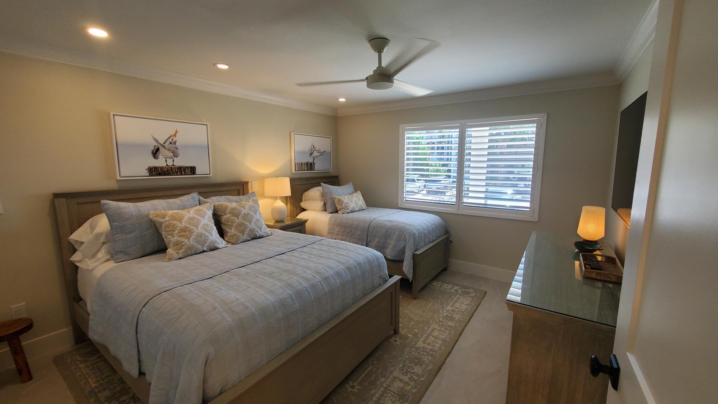 Perfect for guests or family, the second bedroom offers a queen and a twin bed with soothing coastal decor. It also comes equipped with a wall mounted smart TV. An attached bathroom features a quartz countertop vanity, shower-tub combo, and soft, hotel-quality towels.