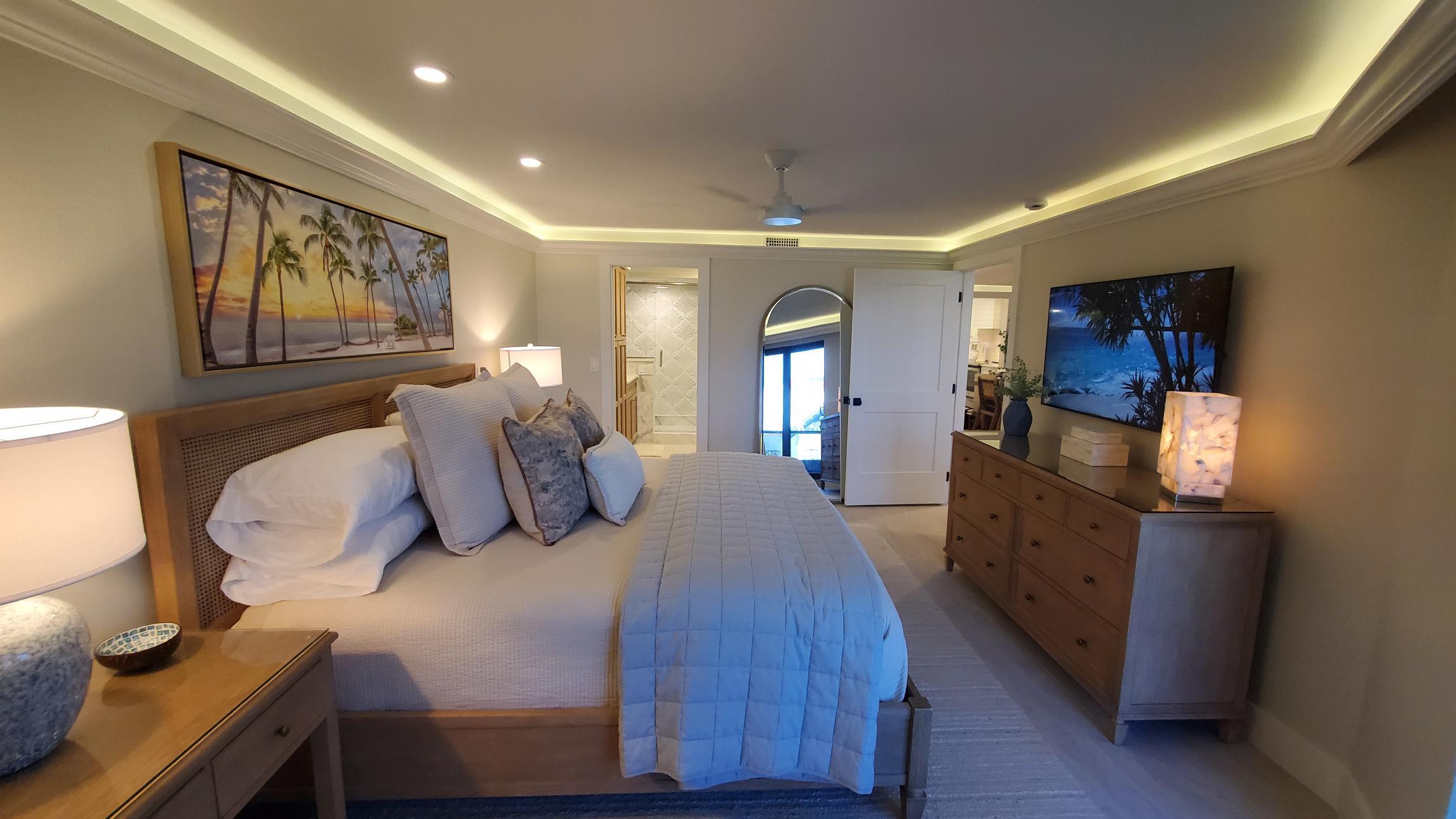 The serene master suite features a king bed dressed in crisp linens, a cozy reading nook, and a calming color palette inspired by the sea. It also comes equipped with a wall mounted smart TV. The spa-style ensuite bathroom offers dual vanities, an oversized glass shower with multiple shower heads, quartz countertops, and a separate water closet for added privacy.