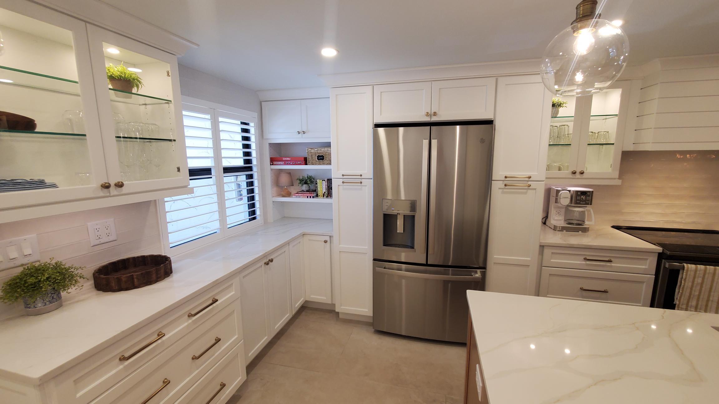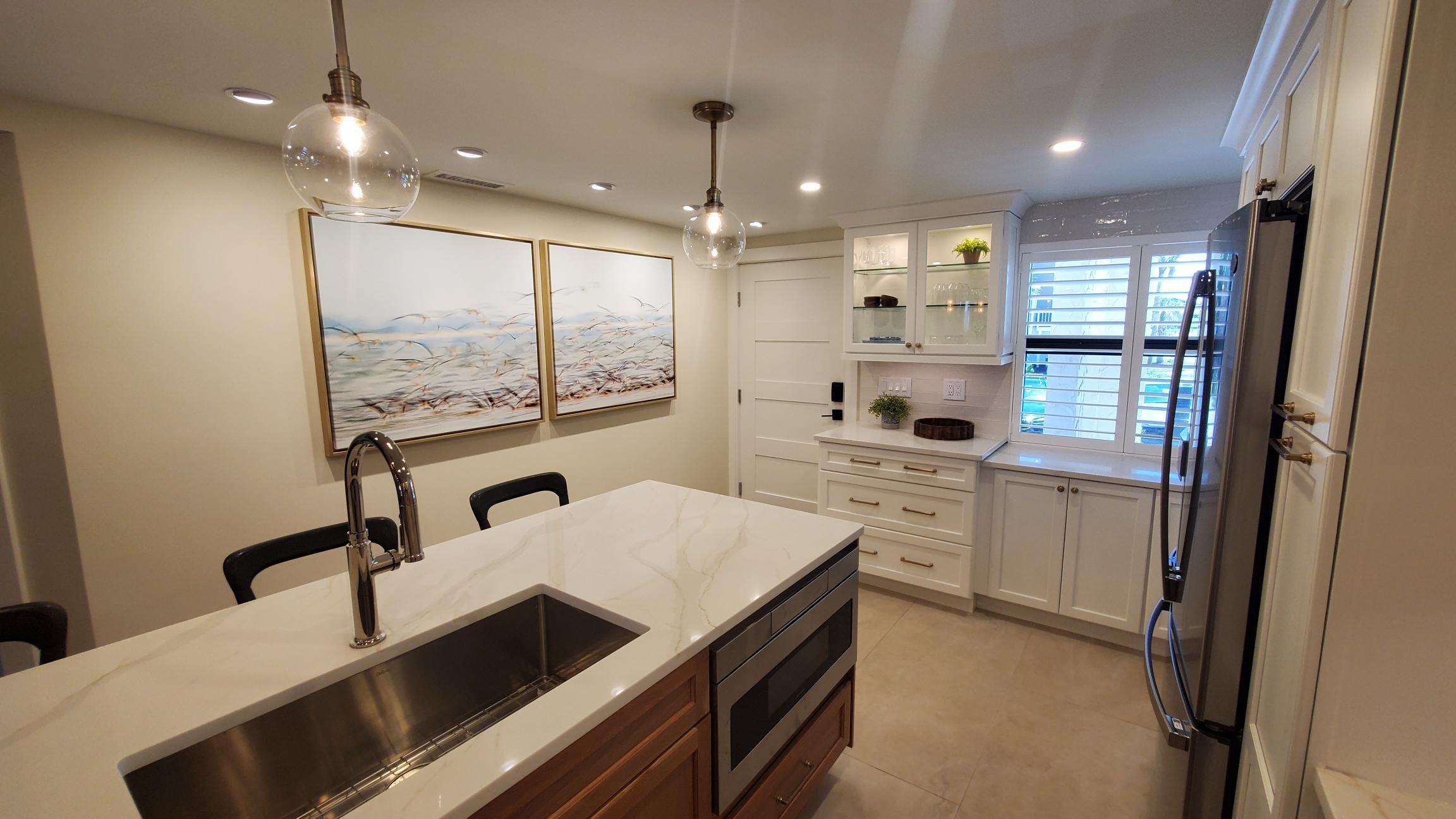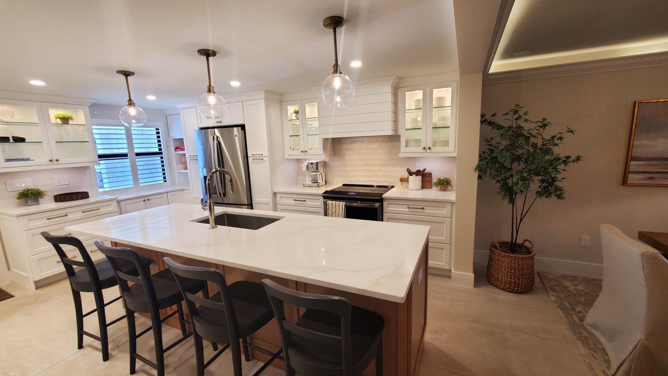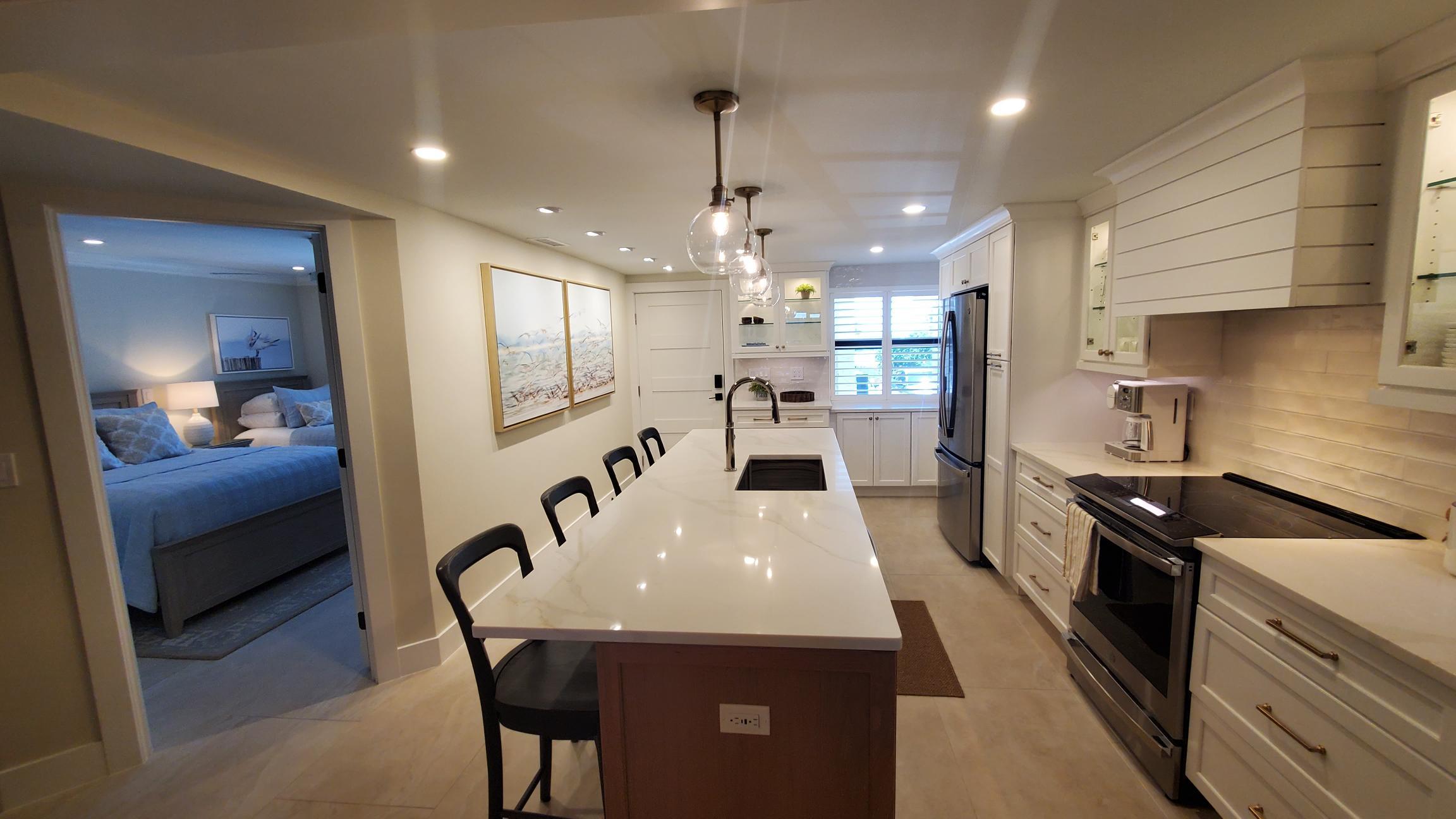 A beautifully redesigned kitchen offers quartz countertops, a large central island, and brand-new stainless steel appliances. Fully stocked with cookware, utensils, glassware, and starter supplies; whether you're preparing a seafood feast or just brewing coffee, everything you need is at your fingertips.